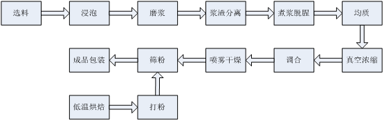 大豆選料→浸泡→磨漿→漿渣分離→真空濃縮→復合酶解→調合→噴霧干燥→篩粉→包裝→成品