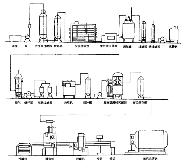 瓶裝胡蘿卜飲料生產所需主要設備有:水處理裝置、均質機、脫氣機、滅菌機、罐裝機、雙聯過濾器、化糖鍋、飲料泵等。